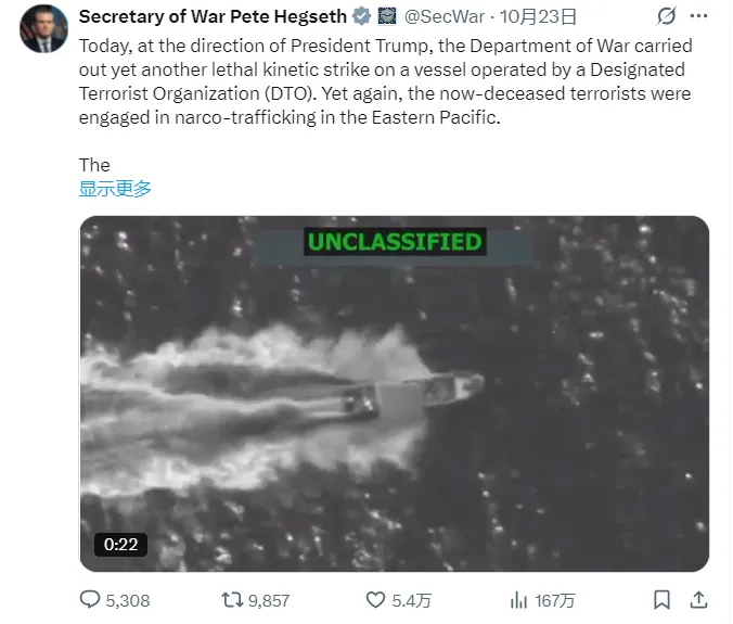 美国防长赫格塞思23日宣布,美军当天又在太平洋东部水域击沉一艘“运毒船”,船上3人全部死亡。同日,飞行追踪数据显示,至少有一架美国B-1B轰炸机靠近委内瑞拉沿岸。
