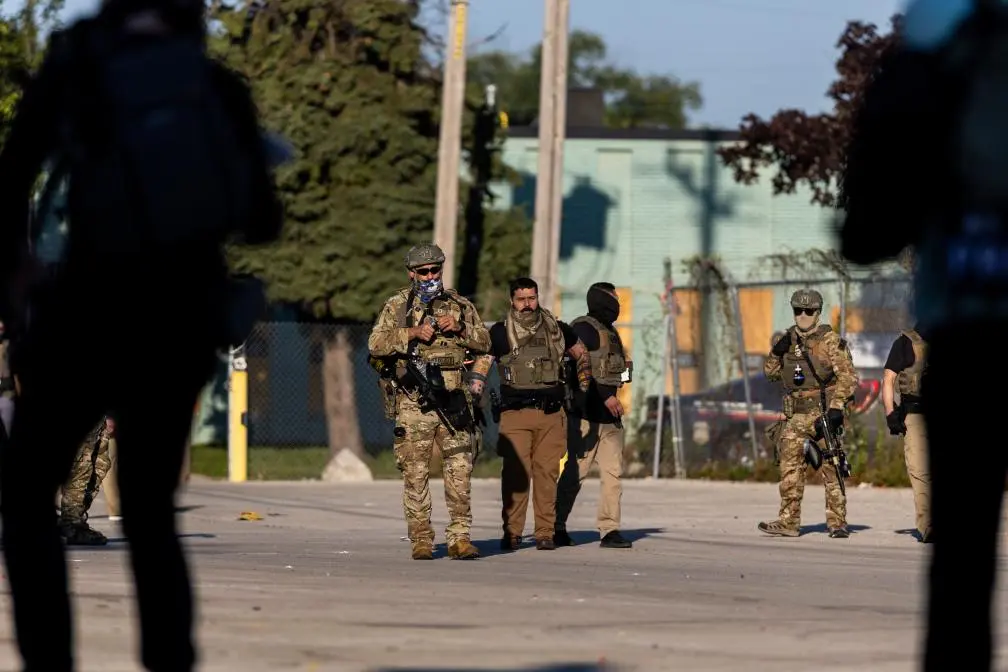 9月26日,在位于美国芝加哥西郊布罗德维尤市的移民与海关执法局办事机构,执法人员在路障内与抗议者对峙。