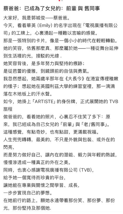 近日,其父郭城俊在社交网发文,宣布女儿已正式加入TVB成为旗下艺人。他写道:“看着华英的名字出现在‘电视广播有限公司’的工牌上,心里涌起一种难以言喻的感觉。那是一张特别的卡片,仿佛一个小小的时代在轻轻转动。她的笑容,依旧那么真挚、那么属于她,一种从舞台延伸到生活里的光,一脉相承的光。她笑容背后,是多年努力与坚持的痕迹;是从芭蕾的优雅,到镜头前的自信与勇气。我忽然想起,她两岁半那年在《大长今》香港宣传活动中稚嫩的模样;想起她在英国利兹大学的练习室里,那一滴滴落在木地板上的汗水声。”