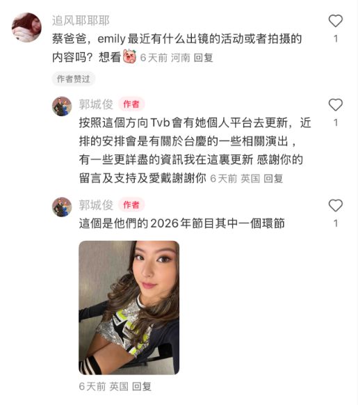 如今女儿加入TVB,爸爸郭城俊看起来非常开心,自参选以来,他就在社交网不断与网友互动,堪称女儿最大粉丝!