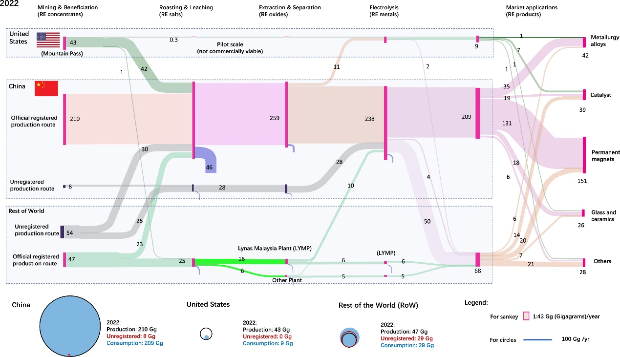 如今,全球85%的精炼轻稀土和99%的精炼重稀土来自中国。这两个数据的背后是几十年时间构建的庞大生产线、供应链和科技树,形成了涵盖稀土的“三位一体”——矿产端掌握全球七成储量、冶炼端拥有最成熟、最低污染的分离工艺、应用端以磁性材料、光学、能源等领域形成产业闭环。而在这背后,围绕基建疏浚、电网铺设、工艺标准、供应链协调、设备升级、人才培养,是一个全生态的相互驱动、共同完善。