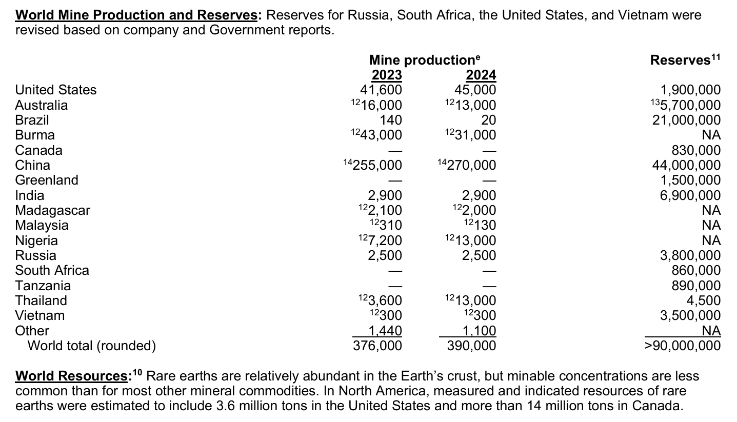 今年发布的矿物商品摘要(2025),稀土资源保有和生产大国中没有乌克兰。这并非是什么机密文件,任何人都能看到。 图表来源:美国地质调查局。