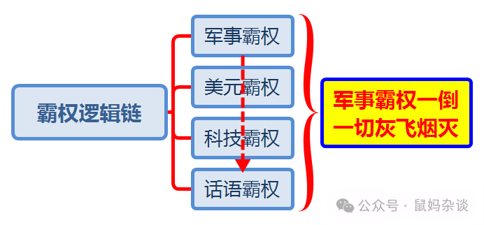 在这个链条中,军事霸权和美元霸权互为支撑,互为底座,军事霸权一倒,美元霸权就倒,美元霸权一倒,就无法赋能军事霸权,二者倒其一,其他霸权就会灰飞烟灭。