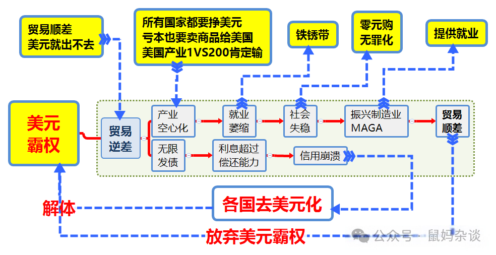 美元霸权的悖论是想拥有美元霸权,用绿纸片子购买世界商品,就必须保持贸易逆差,不然美元出不去,所有国家都要挣美元,他们亏本也卖,补贴也卖,美国的所有产业就会面对其他所有国家的竞争,1VS200,肯定输。