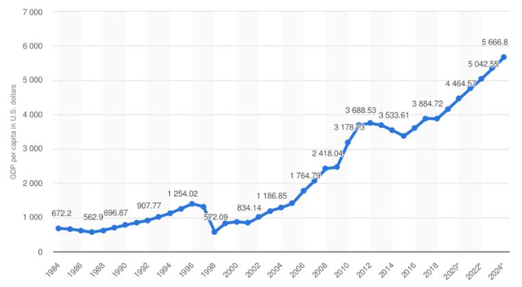 2015年后,印尼人均GDP继续保持高速增长/数据来源:Statista