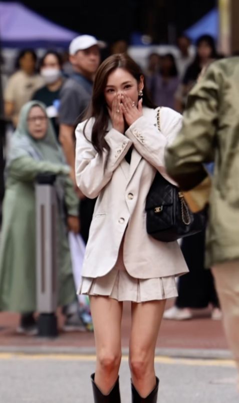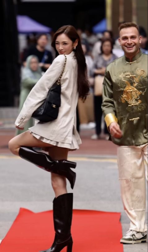 近日他来到香港,邀请了多位艺人、网红在香港街头走红毯,陈桢怡便是其中一位。她身穿白色西装外套搭配短裙,青春洋溢,身高一米七的她身材高挑、外形靓丽,走完红毯后还大方秀出美腿。
