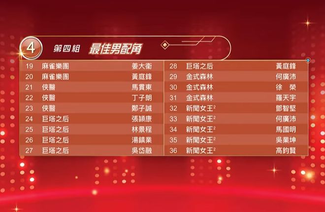 而最佳男配角中,视帝马国明凭客串演出《新闻女王2》入围,而获力捧的丁子朗则分别凭《夺命提示》《执法者们》及《侠医》获得3张入场券角逐。