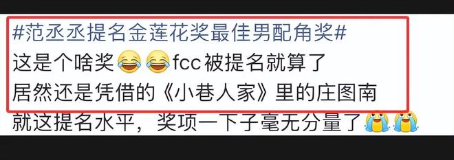 更让人不适的是,面对铺天盖地的演技质疑,范丞丞不仅没正视短板,反倒态度强硬不服气,暗戳戳觉得是网友刻意网暴,好几次在公开场合内涵吐槽,人不行怪路不平,好像他的演技已经好到出神入化的地步,只是观众庸俗,看不透而已,年轻演员该有的谦逊丝毫看不出来。本来演技差这事大家虽然骂,但也不是不能接受,毕竟现在娱乐圈的演员演技都烂,但范丞丞这个甩锅的态度实在是让人无法接受,导致他路人好感度直线下滑。而这次能入围金莲花奖,外界也早有猜测,大概率是背后靠姐姐运作铺路,想靠一个含金量不足的提名勉强挽尊,堵住外界对他演技的吐槽。
