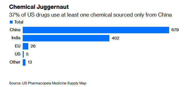 37%的美国药物至少使用一种仅来自中国的原料 彭博社制图