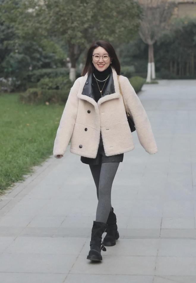 再套一件杏色的羊羔翻领外套,外套的领口翻出来,跟内搭的颜色一致。再加上整体黑白分明,显得和谐又统一。