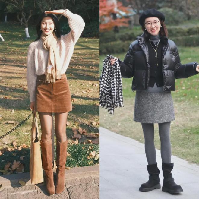 像上面那位姐妹,就是选了一条灰色的打底裤,配上一双黑色麂皮靴和黑色短裤。