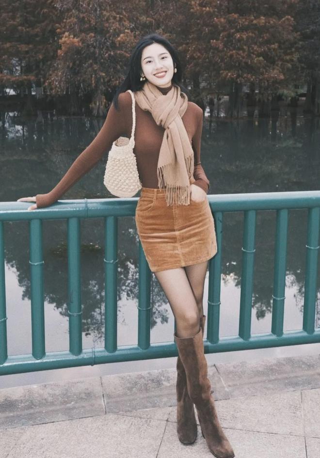 下穿一条灯芯绒短裙,还配了一条浅黑色的打底裤。下搭一双复古的深棕色麂皮靴,配条棕色的围巾更是点睛之笔。