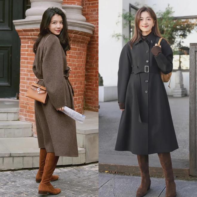 温柔的豆沙粉大衣,腰带一系就能显出腰线。里面穿条同色的长裙,配上一双灰棕色的长筒麂皮靴。