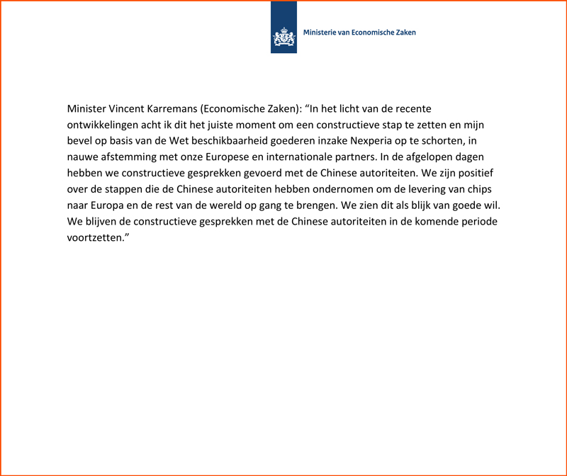 在接管安世荷兰后,面对外界的质疑,荷兰政府发言人极力否认其行动是受到美国的直接指令,声称采取行动的时机与美国发布新规“纯属巧合”。荷兰经济事务大臣卡雷曼斯公然撒谎,称自己从未与任何美国人讨论过此事,一切都是“我自己的权衡”。