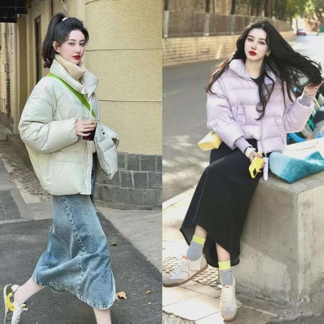 大家不信的话,可以看下图左的博主身上这套穿搭,她就是穿着一件粉色的羽绒服,下身搭配的是一条褐色直筒裙,裙子里边穿了条深灰色连袜打底裤,鞋子是黑色的乐福鞋。