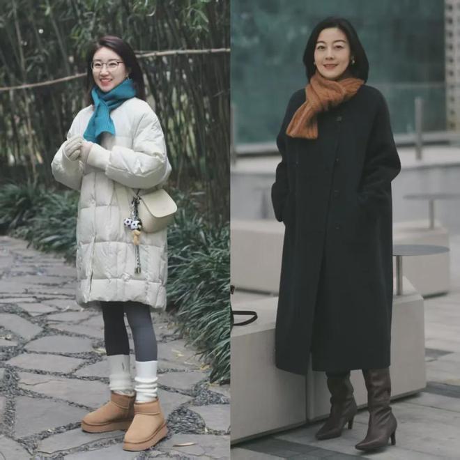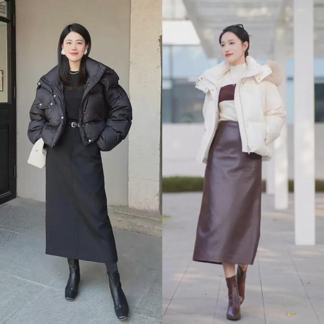 除了直筒裙,我们也可以用直筒裤来搭配中短款羽绒服,或者短款大衣,就像下图左这套。