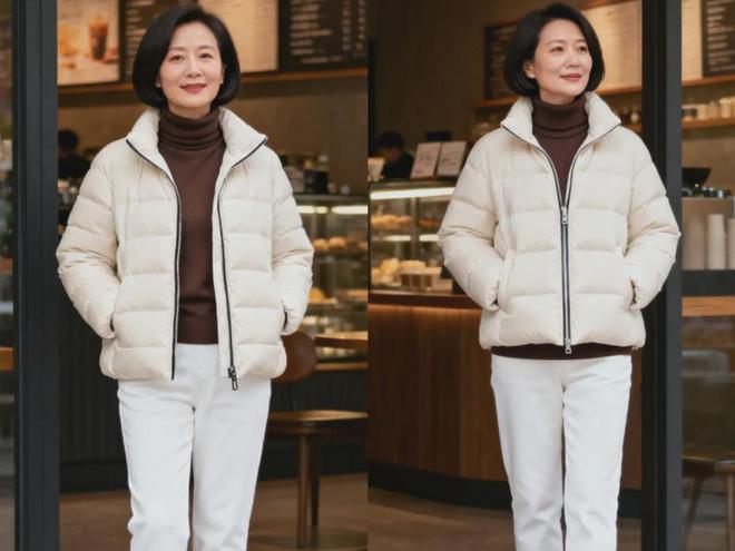 最简单的就是,用一件暗褐色的小高领打底,去叠穿一件米白色的羽绒服。