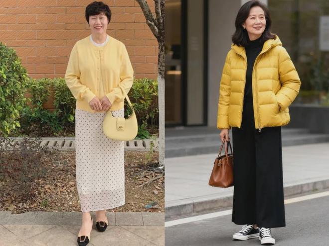 像上图左这位50+阿姨,就是穿了一件浅柠檬黄的针织开衫,配上一条白色的波点半裙。整个人就被衬得温柔又显白,气质也直接拉满了。