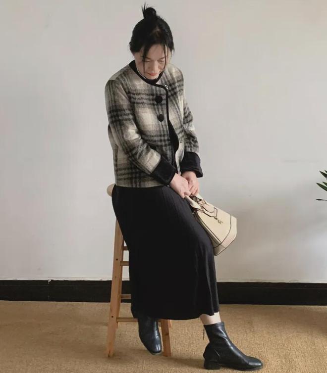 你看上面这位阿姨,穿的就是一件格纹款的外套。下半身则是搭配了黑色的半裙、黑色的短靴,这一套看着就很优雅。