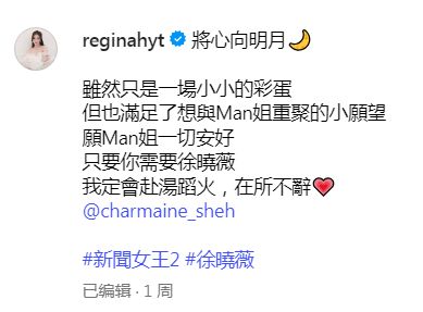 何依婷也在社交网分享出与佘诗曼的合照,她发文称:“将心向明月,虽然只是一场小小的彩蛋,但也满足了想与Man姐重聚的小愿望,愿Man姐一切安好,只要你需要徐晓薇,我定会赴汤蹈火,在所不辞!”