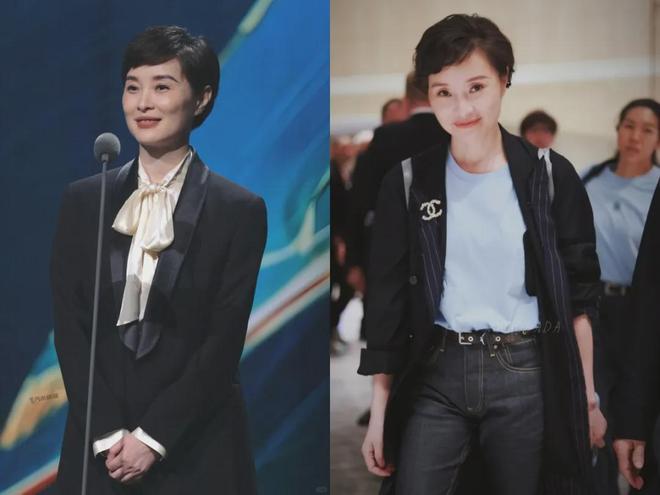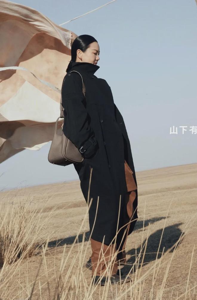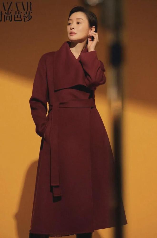 其实说干练风的话,咏梅也是驾驭得住。比如她会梳一个利落的低马尾,穿一件黑色的大衣。