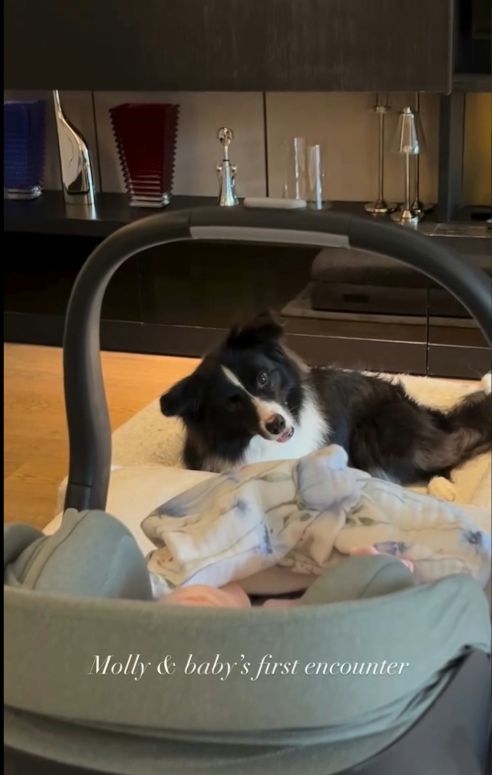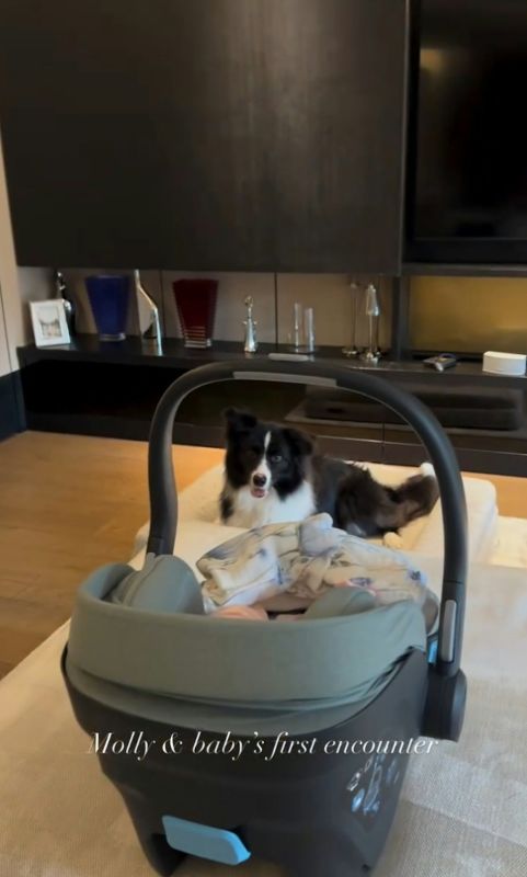照片中小宝宝正在熟睡,十分可爱。丁子田也已经带女儿回到家中,她写道:“welcome homee.(欢迎回家)”。她还拍摄视频记录了爱犬Molly见到女儿的反应,Molly 围着沙发打量婴儿篮,不时侧头张望,似乎对这位家庭新成员充满好奇!