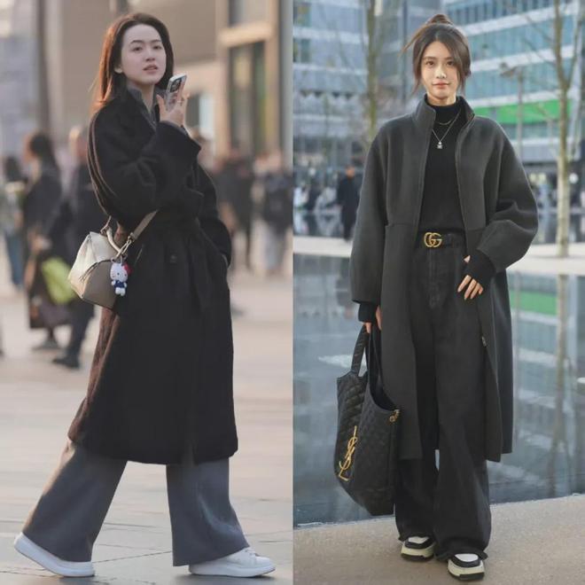 上海、杭州街拍中的“大衣+裤子”的穿搭中,高腰阔腿裤的出镜率是最高的,而且这些小姐姐穿的阔腿裤垂感还特别好,和大衣的线条衔接得特别好,完全不会显得臃肿。