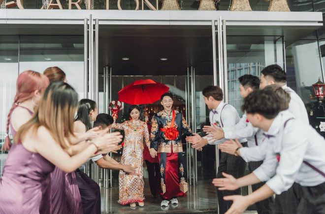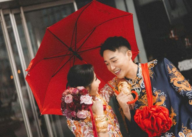 当天早上,新郎容天佑与一众伴郎前往接亲,容天佑身穿藏蓝色金龙刺绣马褂,新娘扶天恩则身穿金线绣龙凤图案的粉红钻褂皇,全身还佩戴满了金器,其中包括一对造型如流星锤的巨型龙凤镯,分量十足,耀眼夺目。
