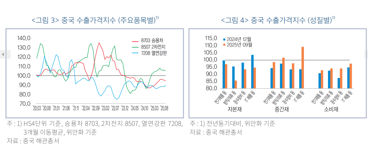 按中国海关和其他的官方数据,中国的出口价格指数,按照重要品目(乘用车、二次电池、热轧钢板),和性质(资本财产、中间财产、消费财产)区分,与资本财、中间财相比,为刺激消费,而直接降价的趋势较为明显。但在报告中没有体现的是消费端的数据,是否包括了补贴。