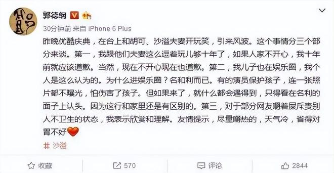 当然了,郭德纲闹出这样的事,大家也不意外,因为他这张嘴确实闹出不少事,很多时候挺让人膈应的,尤其是2016年优酷盛典上对沙溢胡可一家的冒犯,至今想来仍让人觉得生理不适。