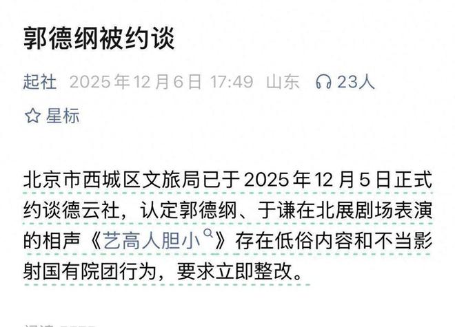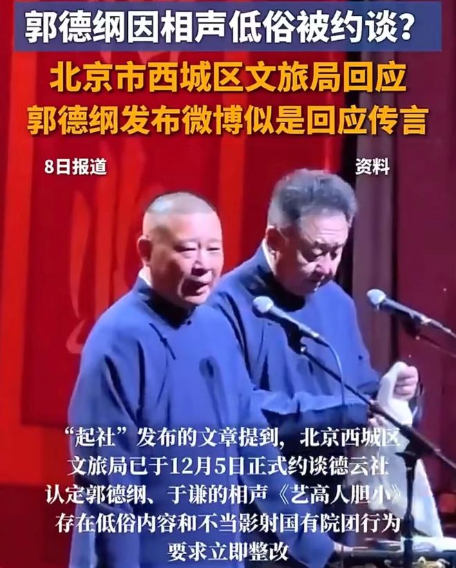 此次风波是因为郭德纲与于谦此前在北展剧场表演的相声《艺高人胆小》,有网友直接投诉了上去,骂这段相声里充斥着大量伦理梗、荤段子,不仅当众辱骂黑粉,甚至还存在造谣抹黑国营院团的不当言论,低俗又无底线,严重造成不良影响 。没过多久,北京西城区文旅局便给出反馈,明确表示演出中确实存在低俗不雅内容,已对演出方和主办方进行严肃批评教育,正式约谈相关负责人并要求立即整改,重新编排台本,杜绝此类问题再次发生 。