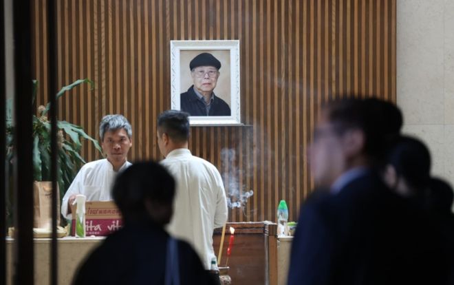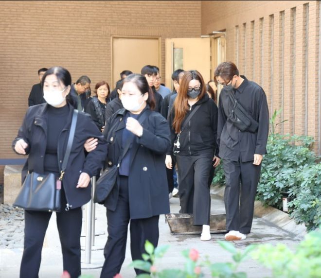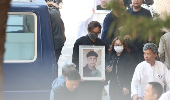 马国明身穿黑色素服,一脸哀伤捧着父亲遗照登上灵车。太太汤洛雯同样身穿全黑服饰、戴着粗框眼镜,陪同婆婆及其他亲友乘坐巴士,汤洛雯细心搀扶婆婆下车,一行人走到大堂入口与马国明会合,一同进场。