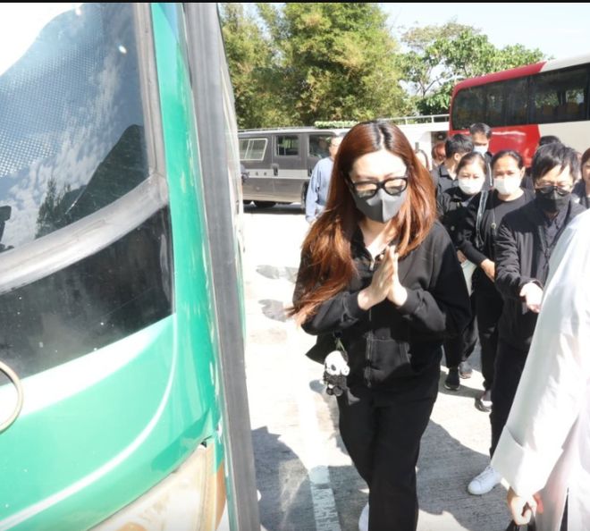 火化仪式结束后,葬礼堂的工作人员带领约30 位亲友跨过火盆,马国明神情哀伤的牵着妻子离开,两人跨过火盆后,又一左一右搀扶马国明母亲上车,期间汤洛雯向记者合十致意。