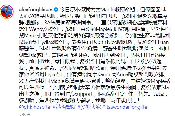 他透露不会只生一个孩子:“从结婚后Maple说可以生四个,到怀孕期间太辛苦,她就说最多生两个,现在Isla出生后,因为生产过程得到了很多支持,她就说可以先生三个。嘻嘻,谢谢老婆,第四个孩子之后再争取,我们一两年后再见!”