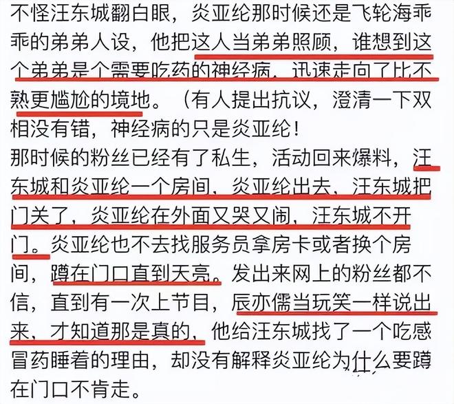 后来私生爆料说炎亚纶不仅不愿意进房间,甚至在外面又哭又闹,就要守着汪东城。汪东城估计那时候发现不对劲了吧。