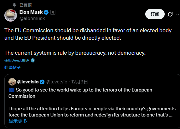 马斯克批评欧盟,认为应该解散;当前的欧盟不民主,很官僚