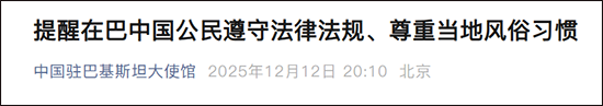 微信公众号“中国驻巴基斯坦大使馆”12月12日消息,近日,个别在巴中国公民因未经允许对当地女性拍摄视频等原因,与当地民众产生争执并造成治安事件。中国驻巴基斯坦使馆特此提醒在巴中国公民务必遵守巴基斯坦法律法规,尊重当地文化传统和风俗习惯,做中巴友谊的维护者、弘扬者。...