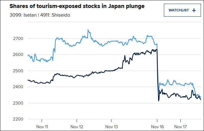 11月中旬,中方发布预警后,日本旅游、消费相关股票遭抛售。 网络截图