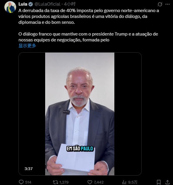 当地时间11月20日,巴西总统卢拉回应美国特朗普政府取消部分关税的决定。 社交媒体