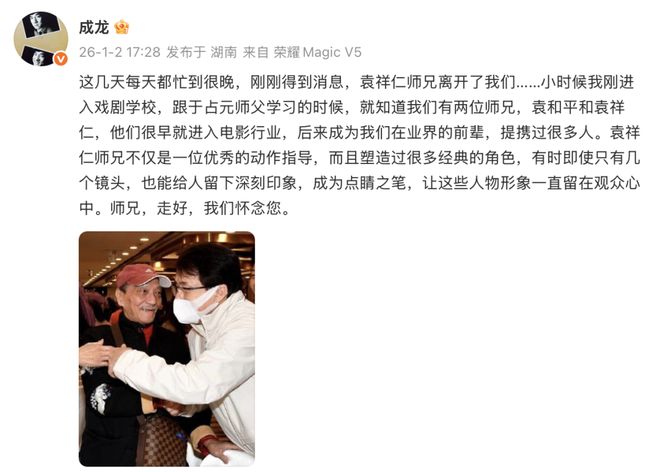 袁祥仁去世后,成龙发文悼念:这几天每天都忙到很晚,刚刚得到消息,袁祥仁师兄离开了我们……袁祥仁师兄不仅是一位优秀的动作指导,而且塑造过很多经典的角色,有时即使只有几个镜头,也能给人留下深刻印象,成为点睛之笔,让这些人物形象一直留在观众心中。师兄,走好,我们怀念您。