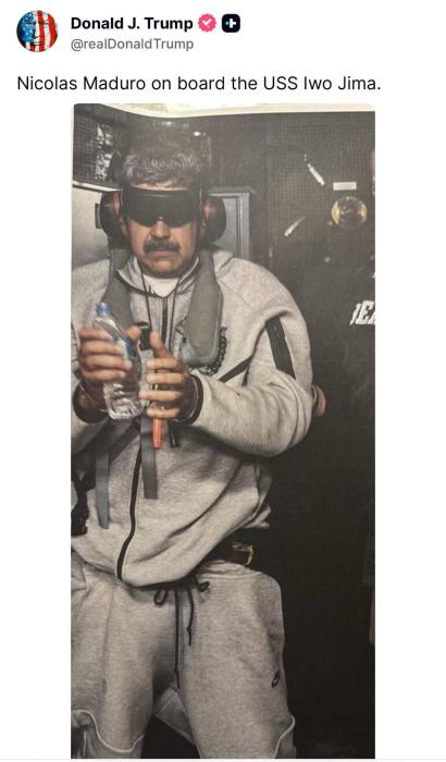 特朗普在社交媒体平台上发布委内瑞拉总统马杜罗在美国军舰上戴手铐、双眼被黑布蒙住的照片,并配文“马杜罗在美国军舰上”。