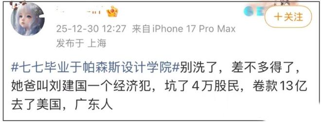 如果说擦边物料和人设造假还只是个人品行问题,那接下来被扒出的猛料,直接让网友们彻底无法接受。有网友发现,如果七七之前的资料是正确的,那她这位上市公司高管父亲疑似卷入一场经济案件,涉案金额高达13亿,还潜逃到美国了。