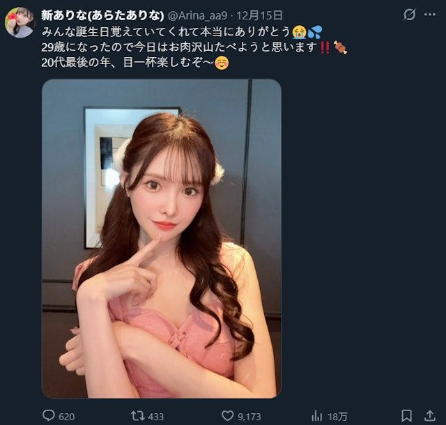 然而惊喜的是,这位「C位担纲」就全面卸下幕前身份,但随着12月15她喜迎个人29岁生日的缘由,亦让大批粉丝们接连于留言区予以祝贺。对此,新有菜除了感动直言下「みんな诞生日覚えていてくれて本当にありがとう(意即:谢谢大家还记得我的生日)」外,更因为写道「因为已经29岁了,今天打算要大吃特吃肉类‼️」的文字关系,可爱显露出其迎来29岁的欣喜之情。
