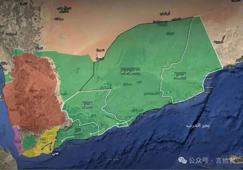 黄色是STC,褐色是胡塞,绿色是也门政府,原本中部地区已经全黄,但短短几天,黄色就只剩下西南部一小块,变化之快,令人反应不过来。