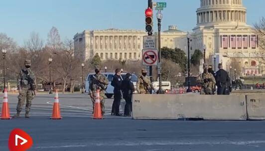 记者看到,白宫和国会大厦周围的路段已经设置了路障,同时配有大批国民警卫队士兵把守,宛如一座兵营。往日里人群往来的景象已不复存在,取而代之的是刺耳的警笛和加装金属围栏的轰鸣。