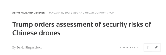 特朗普对中国无人机忌惮已久。2020年12月,美国商务部以“保护美国国家安全”为由,将数十家中国公司列入美国贸易黑名单,进行进出口管制。其中包括中国最大的无人机制造商——大疆。