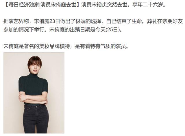 原标题:韩国女星宋侑庭自杀身亡 年仅26岁 网友:走好,下辈子要幸福