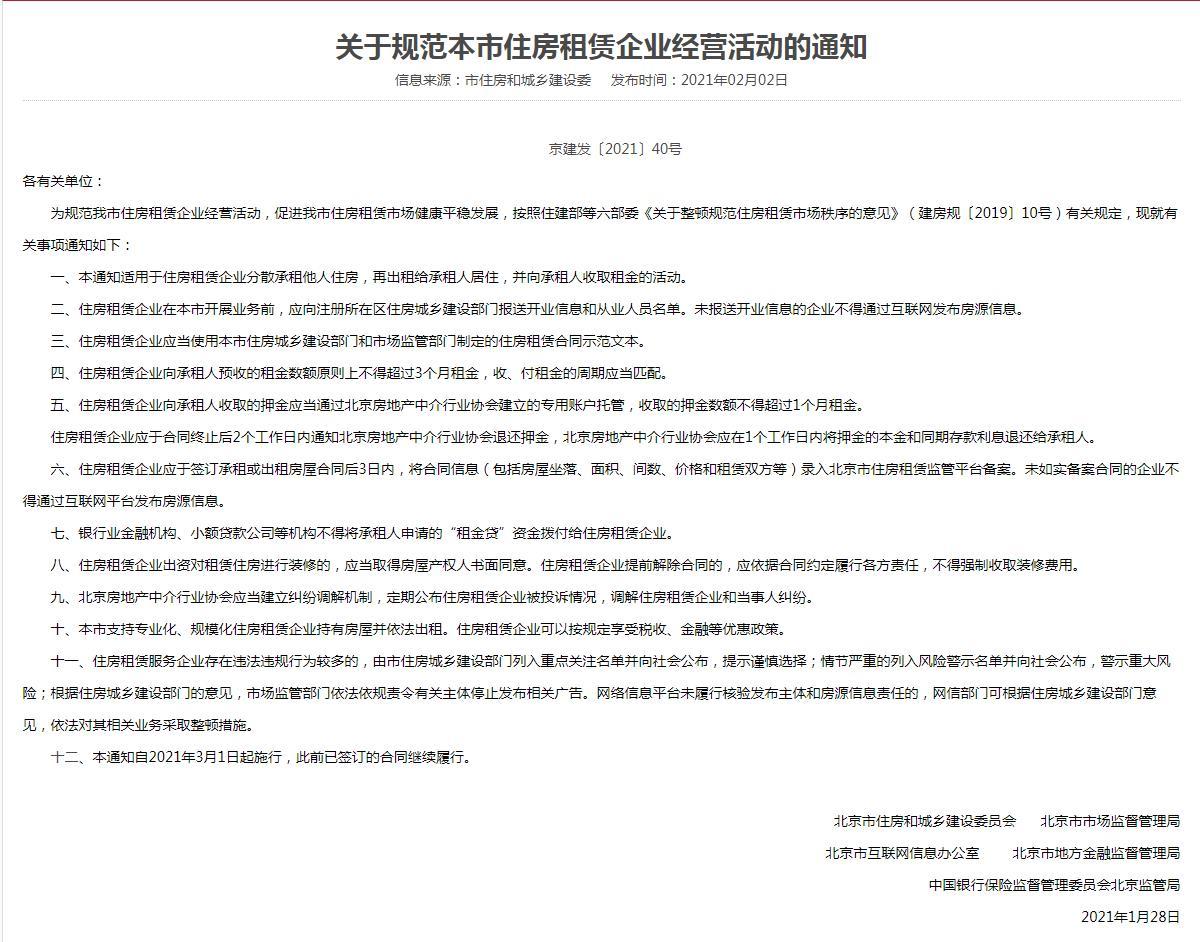 新华网北京2月2日电 2月2日,北京市住房和城乡建设委员会、北京市市场监督管理局、北京市互联网信息办公室、北京市地方金融监督管理局、中国银行保险监督管理委员会北京监管局联合印发《关于规范住房租赁企业经营活动》的通知(以下简称《通知》),自2021年3月1日正式实施。