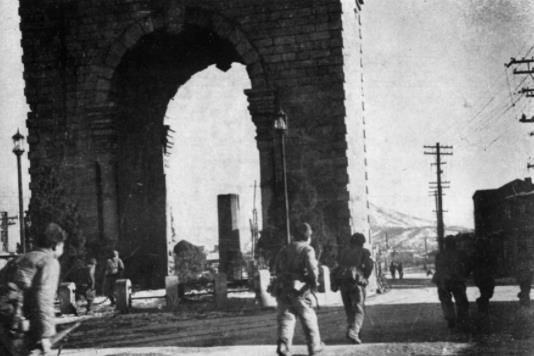 第五十军一部在汉城独立门搜索前进。图源:《战斗在朝鲜》(第五十军政治部1955年编印)