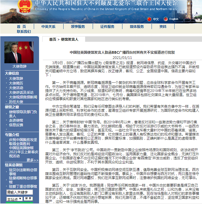 3月9日,BBC广播四台播出题为《假信息之龙》报道,就网络信息、抗疫、外交等对中国进行无端指责。报道播出前,中国驻英国使馆发言人已就报道预设内容致函节目组表达强烈不满,并就相关问题阐明中方立场,敦促其摒弃偏见,改正错误,客观、公正、全面报道中国。